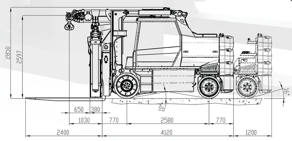 - Fernbedienung (auch Fahren möglich, Lastanzeige) - Arbeitsscheinwerfer - 2x Kameras - Abnehmbare Kontergewichte 6080 kg