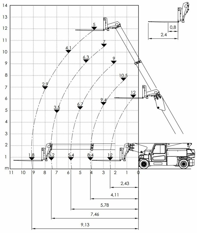 (* 12000 kg bei 0,8 m LSP, siehe Diagramm) (** Transportlänge ohne Gabelzinken)